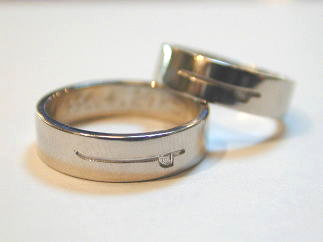 この作品は、最近始めた創り方であくまでも、リングをキャンバスとしてお客様に描いてもらいます。 お客様はサーファーでご自分の板を鉛筆で書いてもらいました。 それが全く同じ絵で出来上がります。 お客様しか出せない、においのあるリングに仕上がっています。 彼女の二十歳の記念にプラチナでペアリングを創りました。
