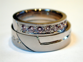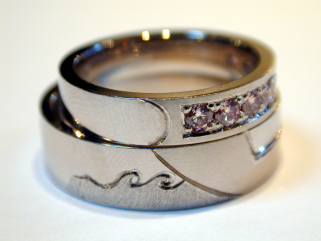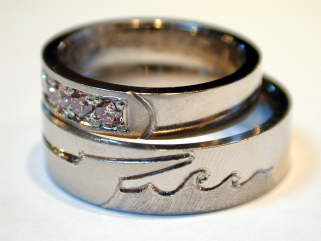 そして新婦さんのリングは風を受ける帆と帆の中にちりばめられた、天然の本当に美しいピンクダイアを埋め込みました。