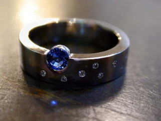 ■製作ポイント このリングはSapphireの夜空をイメージして創りました。 サファイア色の月、そして周りにはダイアモンドの星たち。 サファイアが少しだけリングからはみ出してるのがチャーミングです。