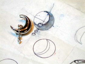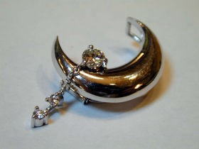 ■製作ポイント 『月のペンダント ブローチ』 この作品は僕の大好きな月をモチーフにさせていただきました。 プラチナでつくったふくらみのある月にダイアモンドのしずくが揺れているイメージです。 ブローチだけではなくペンダントとしても使えるようにデザインしておりますので お使いになる状況に応じてお使いいただけると思います。 お子様の入学式や卒業式にさりげなく本物のジュエリーの存在感を。 そして普段でもガンガン使えるようにペンダントにしてますのでたっぷり可愛がってください。