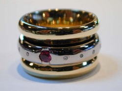 ■製作ポイント このリングは以前からお客様の頭の中にあったデザインをイメージに創りました。 少し幅のあるk18リングにプラチナのリングが回転する様に真ん中にはさまってます。 実はとても難しいつくりです。 久しぶりに面白くて勉強になるリングを創らせて頂きました。 *このリングに使用している、石や地金は全てお客様がお持ちになったものを使用しています。